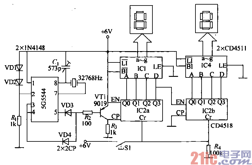Sl是清零开关,当按下Sl时.CD4 518的Cr端便可得到一个正脉冲,使电路清零。因为5G5544集成