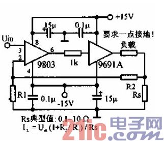 直流至500KHz的100W放大器得用光电运放的高输入阻抗、高增益的特点,实现无变压器输出功率100W。负载电流可达10A,要求大电流配线和大电容电源旁路。此电路用于高保真音频电路、阴极射线偏转和伺服系统。