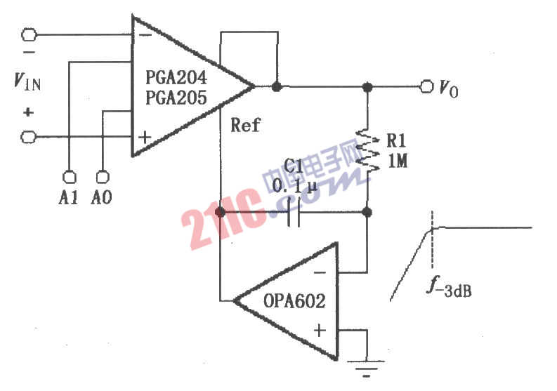 如图所示为由PGA204/205与运放OPA602构成的交流耦合可编程放大器。该电路采用运放OPA602形成反馈到Ref脚,而运放OPA602外接C1、R1后具有交流特性,f-3db=1/2πR1C1=1.59Hz,因此构成交流耦合仪表放大电路。通过A0、A1对PGA204/205进行增益设置,输入信号经过PGA204/205放大后输出。