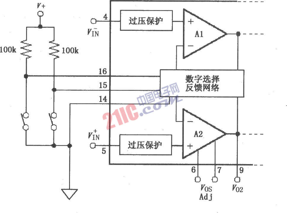 如图所示为PGA204/205采用开关、跳线或集电极开路来选择数字输入的电路。图中采用两个开关和两个100kΩ上拉电阻,当开关拨到V+时为逻辑“1”。这里也可用跳线或集电极开路输出(OC)的方式代替开关,将跳线开路或OC截止来选择逻辑“1”。当需要固定增益时,可直接接到V+,而不必串联上拉电阻。数字地可连接到电源V-。