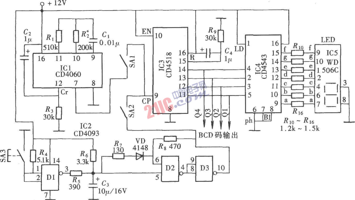 数字显示式时钟信号源(CD4543、CD4060、CD4518)