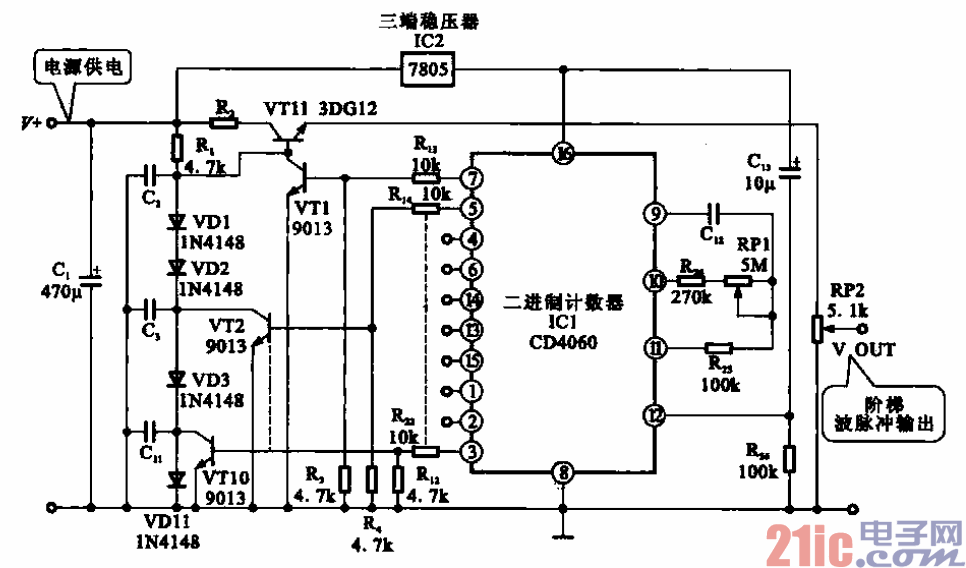 一晶体管导通都会改变VT11基极的电压,于是VT11的发射极输出阶梯波信号。
