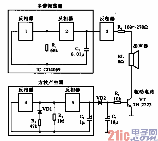 所示为一种谐音信号发生器电路。由反相器l、2及Ri、cl组成一典型的多谐振荡器,用 来产生基本的单音。反相器3为缓冲级,用以激励扬声器发出声响。反相器4、5及VD1、R3、R4、C2 组成另一个方波发生器,具有极低的占空比,用以确定谐音电路的导通时间与衰变时间。VD2、C3. Rs 组成衰变电路,用来按指数方式减小随时间而变化的谐音幅度。