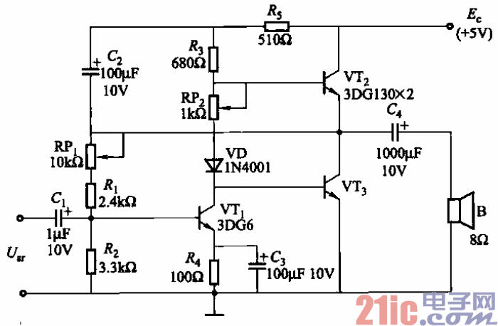 OTL低频功率放大器即无变压器功率放大器。其性能优良,常用在要求高传真的扩音 设备中。其电路如图