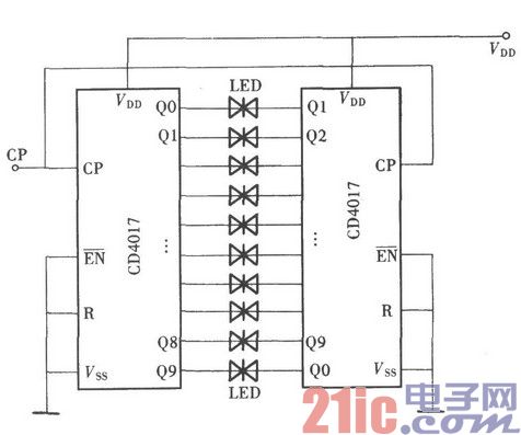 用CD4017的十个输出端随着输入时钟脉冲而移动的特性,在它的每个输出端连接一个发光二极管,随着输出端输出位置的移动,使发光二极管依次发光,可以组成一个模拟钟摆电路。将其安装在数字式电子钟表上,既可显示钟表在走动,又是一种装饰。电路的组成如图所示。