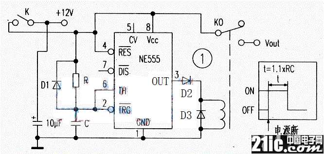 在图1、图2的电路工作时.只要手动开关K接通+12V电源.由NE555组成的单稳态电路工作,其③脚输出高电平。在图1电路中,由继电器触点K与 Vout接通+12v电源供外接负载使用:在图2电路中,当晶体管T(PNP型)导通,其Vout与+12V电源接通,供外接负载使用。