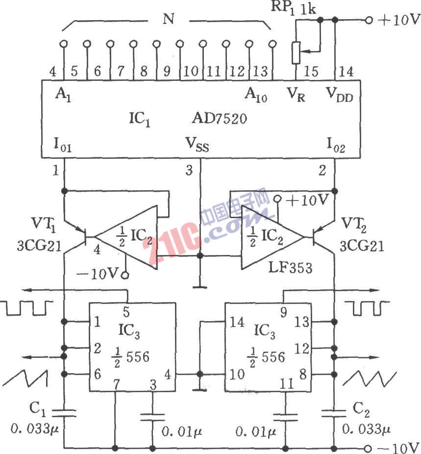 如图所示,AD7520是CMOS型10位多路DAC集成电路,可提供与l0位数字输入量N成正比的输出电流Io1,还可提供与(1023-N)成正比的电流Io2。VT1、VT2及宽带双运放LF353N为电容器C1、C2提供充电电流。当C1、C2上的充电电压达到阈值电平2/3 VDD时,556复位;C1、C2通过基片内相应的放电管放电,至1/3 VDD,然后又置位,以与N成正比的Io1和与(1023-N)成正比的Io2的速率重新充电。因Io1与数字N成正比,故可获得l0~10000Hz的频率输出。555可同时提供脉冲和锯齿波输出。RP1用于调节频率范围。