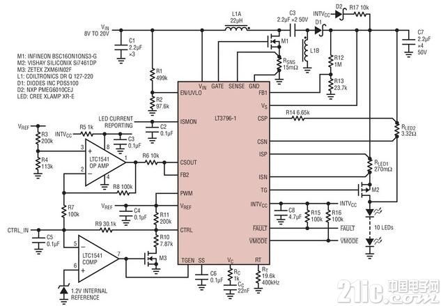 LT3796 / LT3796-1 是 DC/DC 控制器,专为调节一个恒定电流或恒定电压而设计,且非常适合于驱动 LED.固定频率和电流模式架构在一个很宽的电源和输出电压范围内实现稳定的操作。两个参考于地电压 FB 引脚用作多个 LED 保护功能电路的输入,而且还使转换器能够起一个恒定电压源的作用。LT3796 / LT3796-1 内置了一个具轨至轨共模范围的可编程门限输出检测放大器。一个单独的高端放大器可利用两个电阻器来配置增益,以及可用来调节第二个电流或一个电压与其中一个 FB 引脚的结合。PWM 输入提供了高达 3000:1 的 LED 调光比。