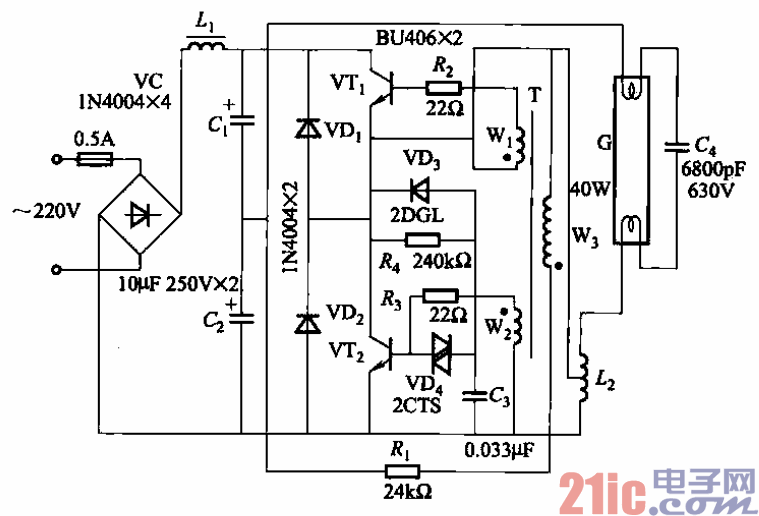 (8)荧光灯电子镇流器电路之八 电路如图2-18所示。该电路较图2-14相比有所改进,整流滤波后的电压经电容cl和 C2分压后,分别加到三极管VTi和VTz上,所以两管的实际承受电压比前者减小了一半。 同时还并接了二极管VDi、VDz作反向过压保护,使开关功率管VT!、VTz的运行更为安 全可靠。