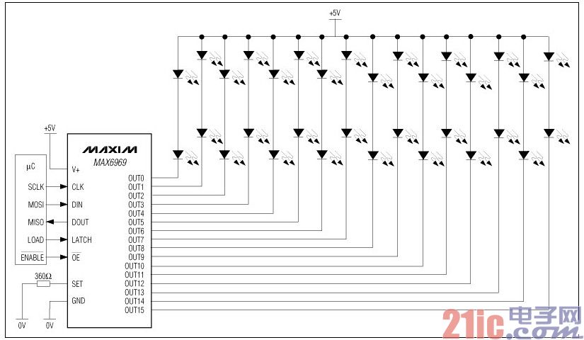 MAX6969采用工业标准的移位寄存器加锁存器形式的串行接口。数据通过数据输入DIN和时钟输入CLK移入16位移位寄存器。16个时钟周期后,输入数据出现在输出端DOUT上,这样,可允许多个MAX6969级联。锁存使能输入LE将移位寄存器的16位数据装入16位输出锁存器,以设定各个LED的开关状态。输出使能/OE控制所有16路输出的开关状态,其快速响应特性适合作为控制LED亮度的PWM输入。