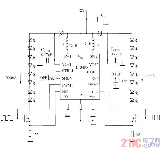 这两个LED串的调光可以通过各自的CTRL引脚独立控制,内部PWM调光系统可通过向各自的PWM引脚提供PWM信号,从而把调光范围扩大到1000∶1。LT3486的工作频率可以用外部电阻设置,其范围为200kHz~2MHz。其电流检测电路具有低的反馈电压(200mV),降低了该检流电阻的功耗,提高了电路的工作效率,并具有LED开路时的输出限压功能。