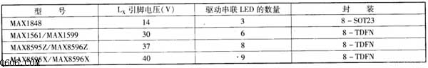 表给出了几款电感式升压开关变换器Lx引脚的额定电压及可以驱动的串联白光LED的数量。Lx引脚的最大额定电压与白光LED串联后的最大电压之间需要保留一定的安全裕量,以允许过压关断。