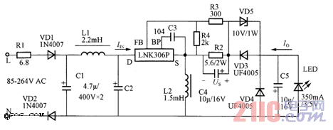 如图电路基本工作原理如下:输入电路由可熔断电阻R1、VD1、VD2、C1、CZ和滤波电感u组成;电源调整电路由LNK3OGP、储能电感L2、VD3、R2 、C4和C5组成。当LNK306导通时,输入电流I,经(LNK306)D→(LNK306)S→L2→C2(—)构成回路,将输入电流IIN储存在电感L2中(电 感电流按UI/LI,线性增加),极性为上正下负;当LNK306截止时,因电感电流不能突变(电感电流按UI/L1线性减小),极性为下正上负;L2 中储存的能量经L2的下端(地)→LED(负载)→VD3→R2→L2的上端构成回路。VD3为整流管;C5是输出滤波电容;R2为限流保护电阻;C4与R2 并联以消除杂讯干扰;VD4与VD5构成简单的稳压电路。负载电流r。在R2上产生的电压降是Us=IOR2,Us经R3与R4分压,在R4上得到的分压电压 作为反馈电压给LNK306的FB端,FB端正常工作电压是1.65V,可通过调整R3与R4分压比来调整输出电流的大小。LNK306的FB端根据反馈电压的大小来控制内部MOSFET的导通时间,即通过跳过周期的方式来对输出电流进行调节的。当输出电流增加时,Io在R2上产生的电压降也线性增加, 在R4上的分压值也增加,因此流入引脚FB的电流IFB也会增加,若电流IFB>49μA,则随后的周期将被跳过,直到IFB(49μA;反之相反。因此当负载减轻时将跳过许多周期,负载加重时跳过的周期减少。如发生输出过载或短路故障时,Linkswitch-TN开关就进入自动重启动阶段,输出功率降为POM×6%,从而限制了平均输出功率。