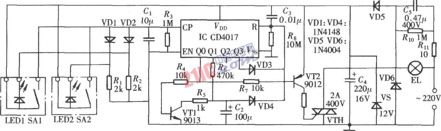 CD4017构成的延时灯控制器电路: