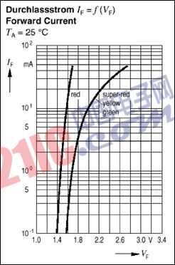 对于5mm直径的标准LED,图1给出了其正向导通电压(VF)与正向电流(IF)的函数曲线。