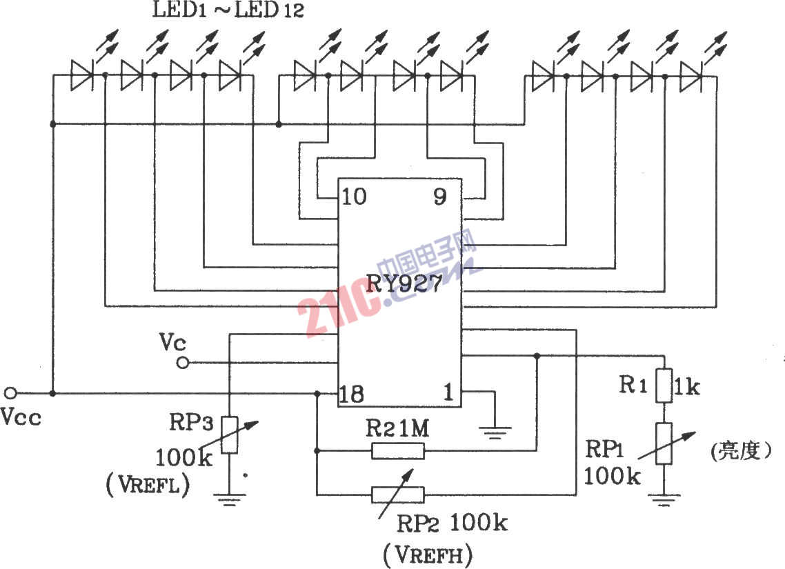 RY927多段LED驱动线性显示器典型应用电路