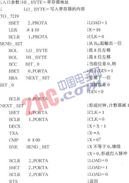 由MAX7219串行接口8位LED显示驱动集成电路与68HC05单片机构成的接口电路图 初始化 通电后7219进入关断方式,至少经过250肚s才退出。因此必须对它们进行必要的初始化后才能正常工作。包括退出关断方式、指定译码方式和被译码的数位、设定亮度和扫描限等。考虑到程序可能在热启动运行,因此在初始化程序开始也可先进入关断方式,即完成如下操作: ?写入O000H,关断7219 ?延时至少250µs ?写入0001H,退出关断方式 ?写入091FH,数位0~4为译码方式 ?写入0AOFH,置为最亮状态 ?写入0805H,设扫描限为数位0~5显示 ?写入0F01H,进测试方式,各段全显示 ?延时5s ?写入0F00H,退出测试,进入正常方式 显示驱动程序