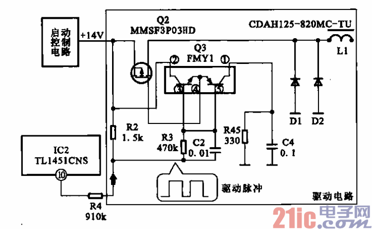 由图可知,控制芯片IC2的⑩脚输出的PWM脉冲信号,经Q3缓冲放大后激励Q2,Q2工作于开关
