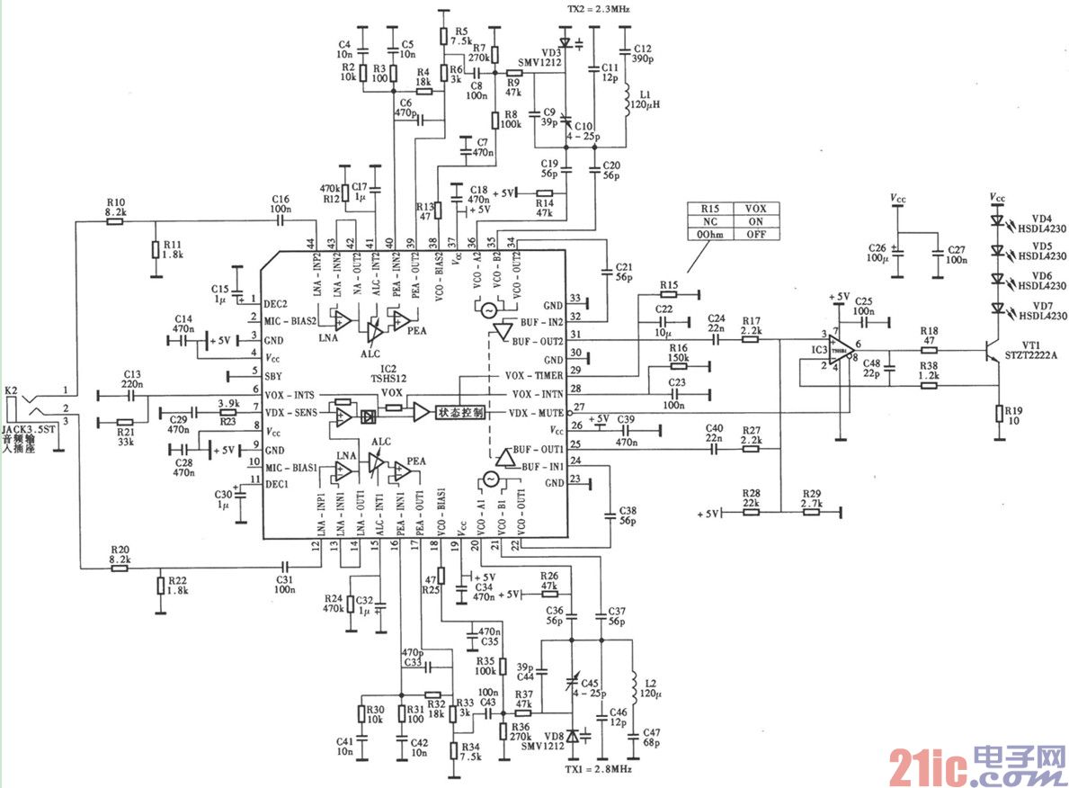 采用TSH5111/TSH512红外立体声耳机发射电路图如下所示: