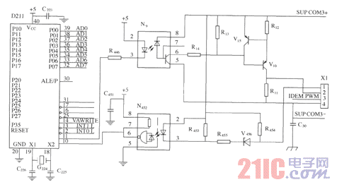 监控模块与整流模块的通信电路如图所示。光耦N9和N452在微处理器D211和整流模块之间提供了隔离,N9隔离发送缓冲器V15和V10,发送缓冲器V15和V10设计为可提供100个整流模块的通信的驱动能力,N452是一个高增益的光耦缓冲器,用于接收整流模块发送过来的信号。