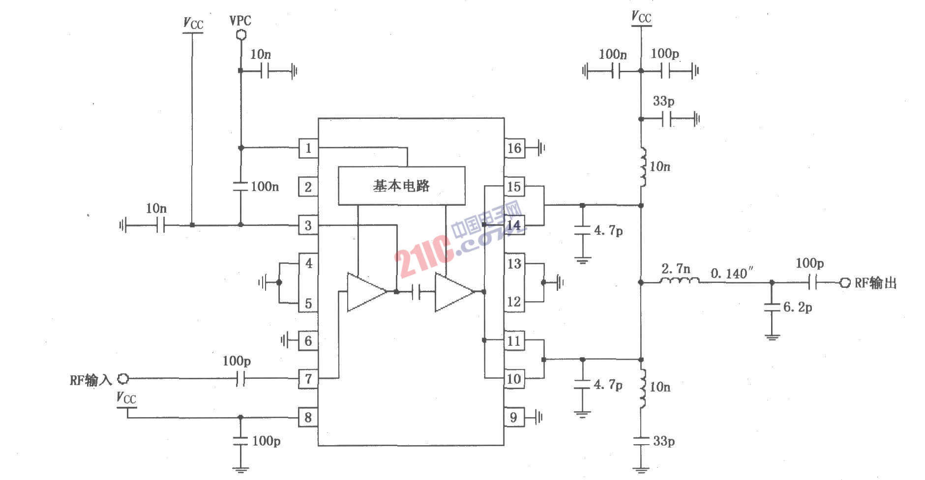 RF2131在4.0~4.8V电源供电时获得最佳功率和效率放大器电路图: