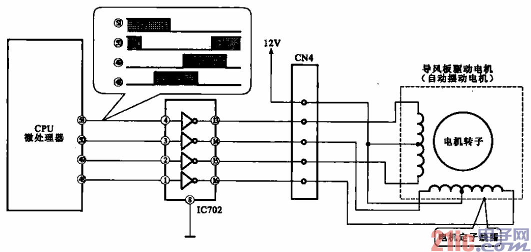 所示是空调器水平导风板驱动电动机及电路的结构。该电动机是步进电动机,驱动信号由 CPU@~@脚输出,经IC702放大后去驱动电动机。分别检测CPU的输出信号和IC702的输出信号可以 判别故障。IC702输出的信号与CPU的输出信号相位相反。如有信号驱动,而电动机不转,则电动机有 故障:如无信号,再查电源供电,电源供电正常则驱动电路有故障。