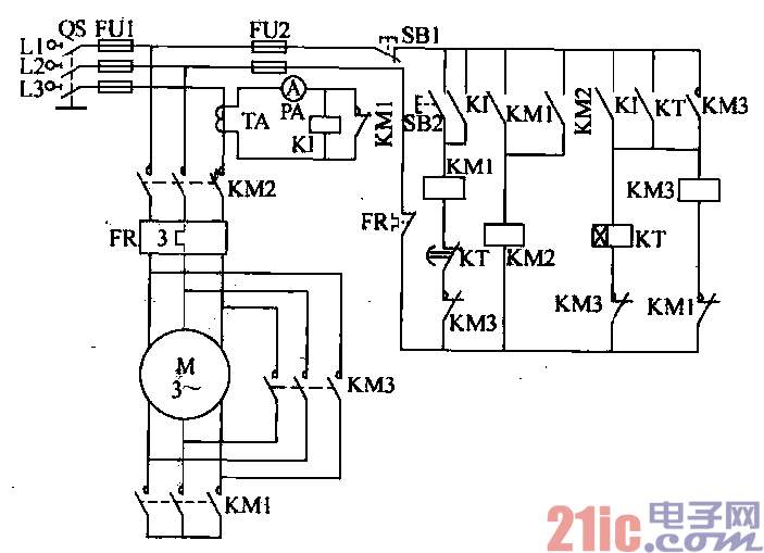 KT得电吸合。当电流降到额定值后,KI失电释放,KM1随即释放。KM1动断触头断开,使接触器KM3