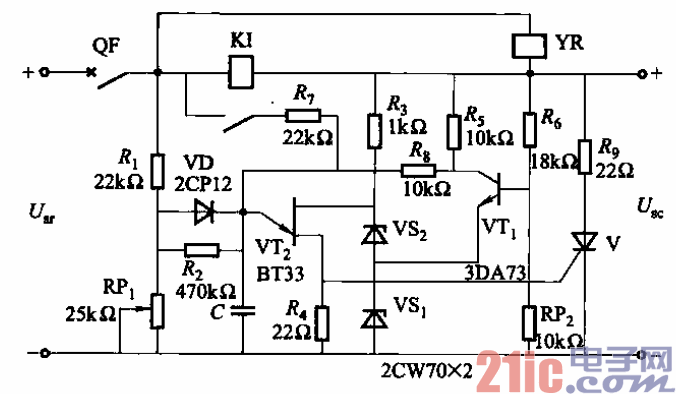 该保护电路在直流电源输入电压大于30V或小于18V或负载电 流超过35A时,晶闸管都将被触发导 通,致使断路器QF跳闸。图中,YR 为断路器QF的脱扣线圈;KI为过电 流继电器。