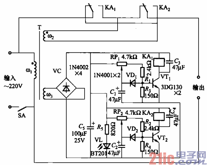 它是DZW型交流自动稳压器电路。调节电位器RP.,可改变电 压下限设定值;调节RP2,可改变电压上限设定值。