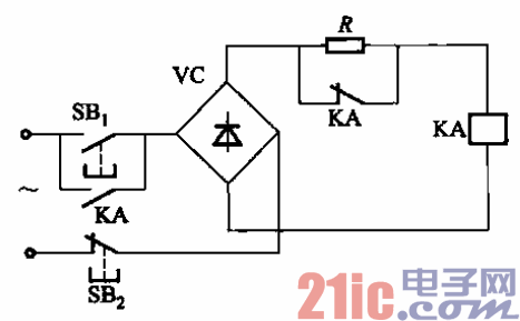 继电器节电电路之三 电路如图所示。继电器KA吸合后即串入限流电阻R,保持KA吸合状态。