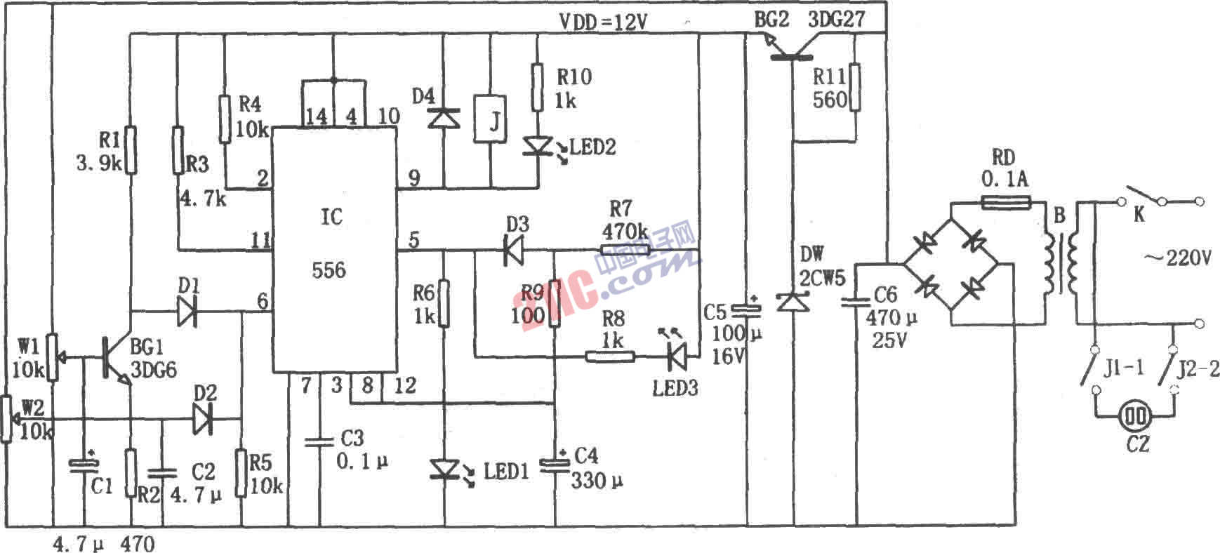 如图所示为电冰箱过压、欠压、断电延时保护器电路。该电路由过压和欠压取样电路、触发电路、延时电路、降压整流电路等组成。其中降压整流电路为整个电路提供直流电压。