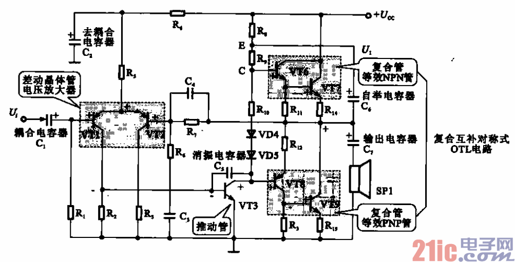 大后从其集电极输出。VT3的集电极输出的正半周信号经VT6和VT7放大后,由C7耦合到SP1中,在
