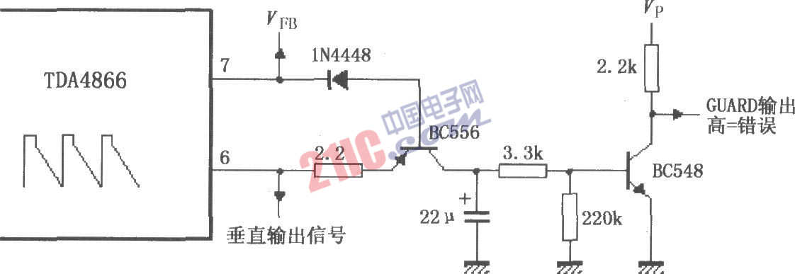 如图所示为由TDA4866构成的外部保护信号发生器电路。该电路的作用在于内部防护失控时,外部保护电路起作用。正常工作时垂直输出信号的幅度较大,三极管BC556导通,同时三极管BC548获得基极电流也导通,输出低电平作为正常工作指示。当工作不正常时,垂直输出信号幅度较低,三极管BC556截止,同时三极管BC548无基极电流也截止,输出高电平作为错误工作指示。