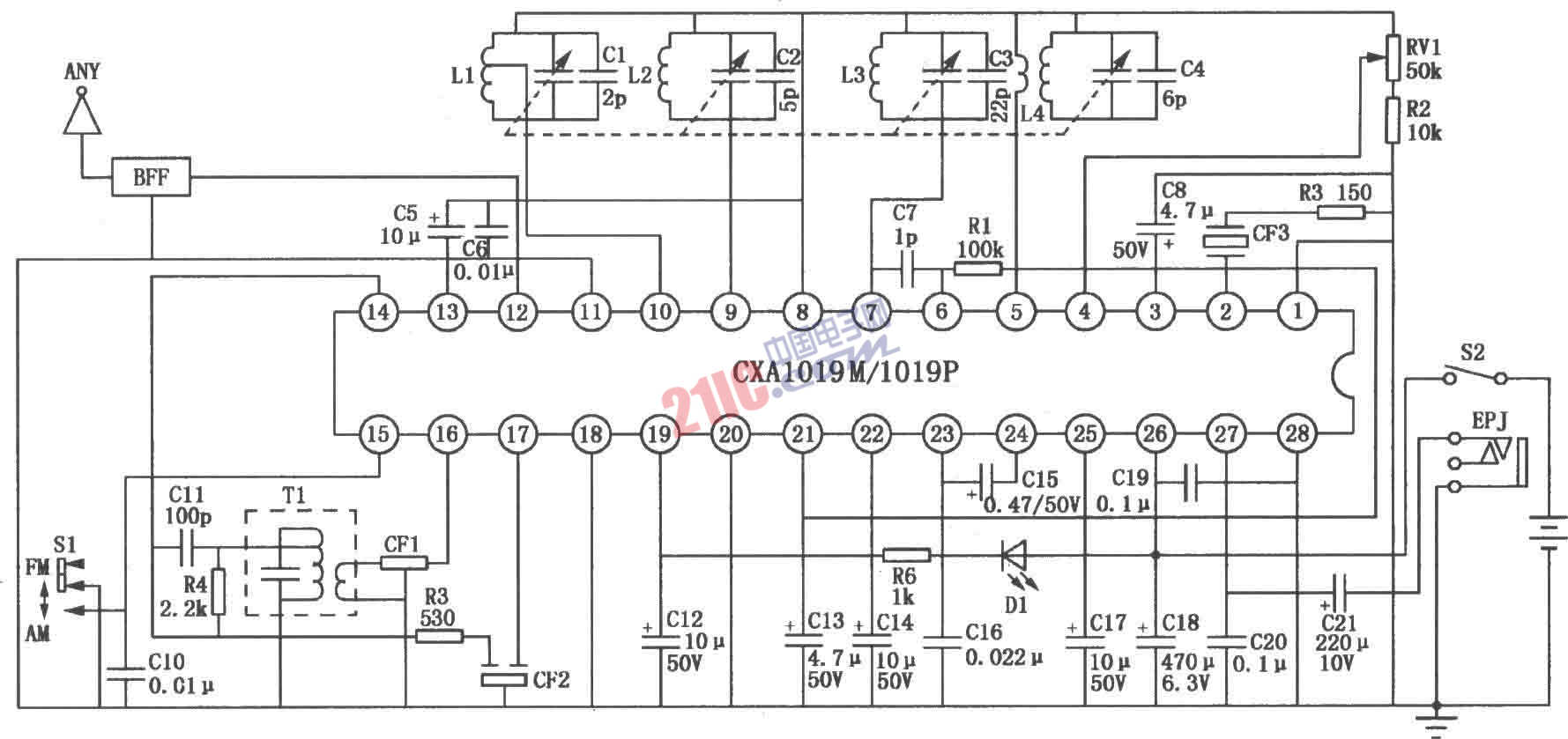 CXA1019M/1019P/1019S FM/AM单片收音机电路