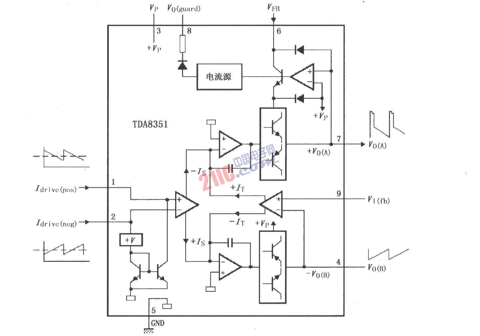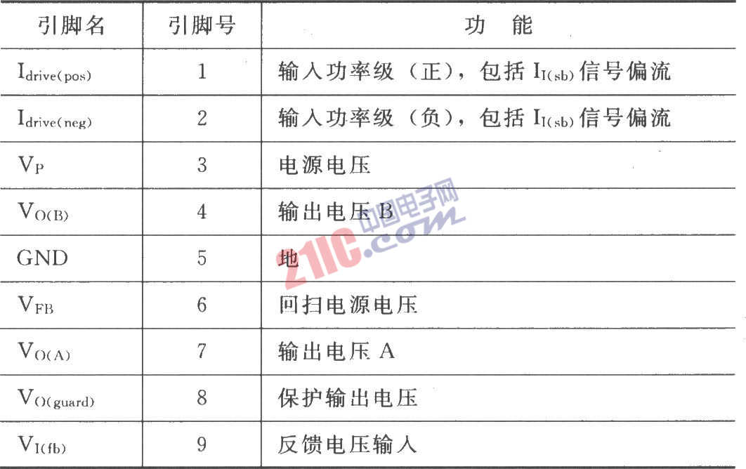 TDA8351/8356是用于90o和110o彩色偏转系统的功率电路,场频为50~120Hz。电路提供一个DC驱动垂直偏转输出电路,工作于高效率G级系统。TDA8351/8356具有防护信号缩放模式、高EMC抑制(输入共模信号)和垂直回扫开关。TDA8351/8356的引脚排列及功能如图所示。