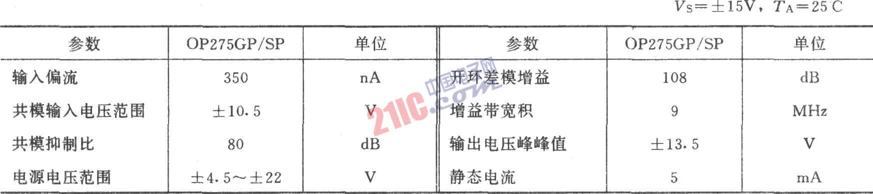 OP275双集成运放的主要参数(典型值):