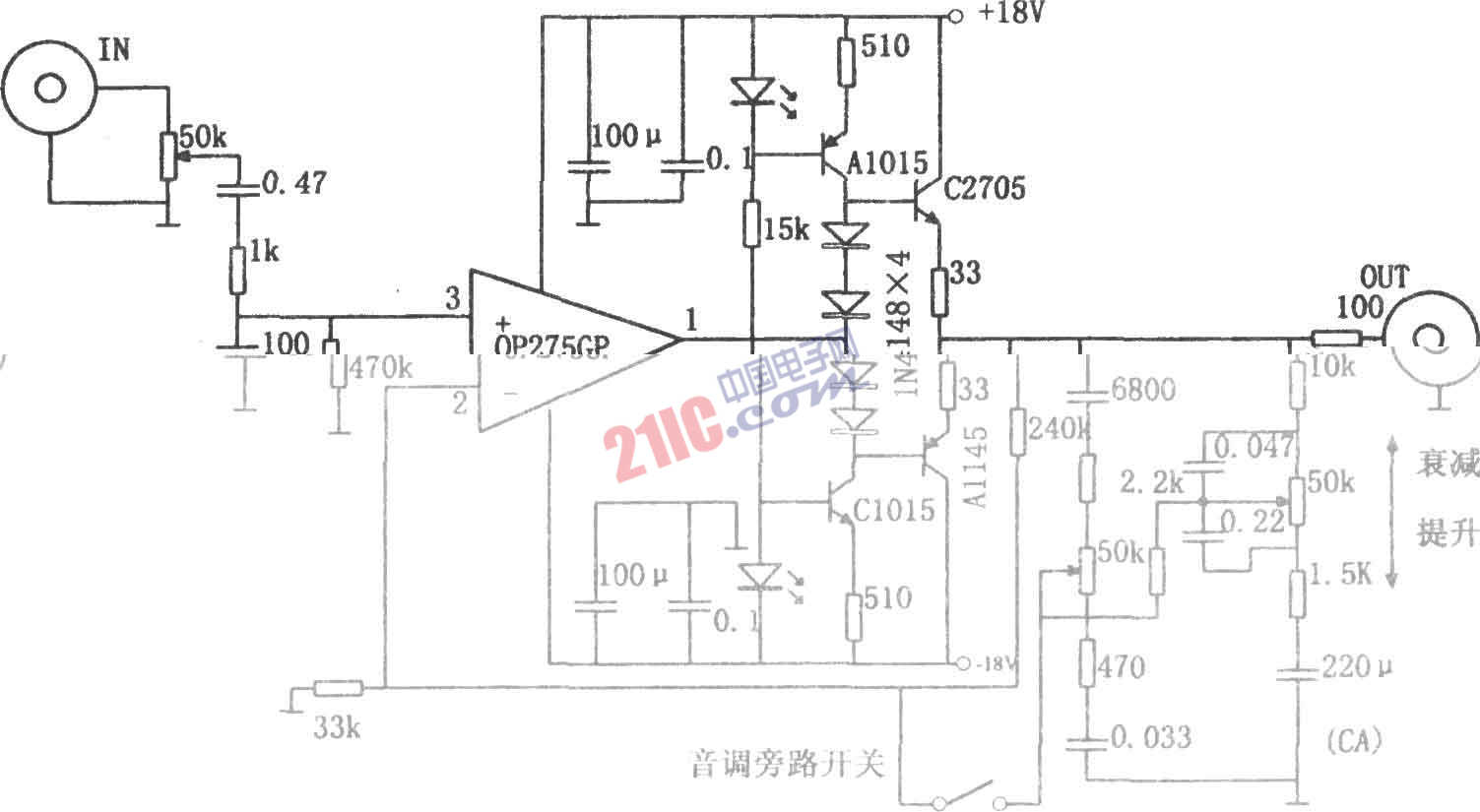 如图所示为具有音调控制的音频放大电路。该电路采用了场效应管输入型双运放OP275。输入信号经50kΩ的电位器、双时常数RC网络送入OP275的同相输入端(引脚3)。由于采用了同相输入方式,因而其输入阻抗很高,双时常数RC网络具有选频作用,以减小外部噪声干扰。该电路具有放大微弱信号的能力,且失真很小,当信号幅度较大时,可调节50kΩ的电位器作适当衰减。信号经OP275放大后由引脚l输出,送入互补对称功放电路,该功放级由A1015、C2705和C1015、A1145组合的复合管构成射极输出级,由图可知,该功放级工作于AB类状态。4个1N4148分别为C2705和A1145提供正偏,复合管的前级三极管的正偏也由2个1N4148二极管提供。