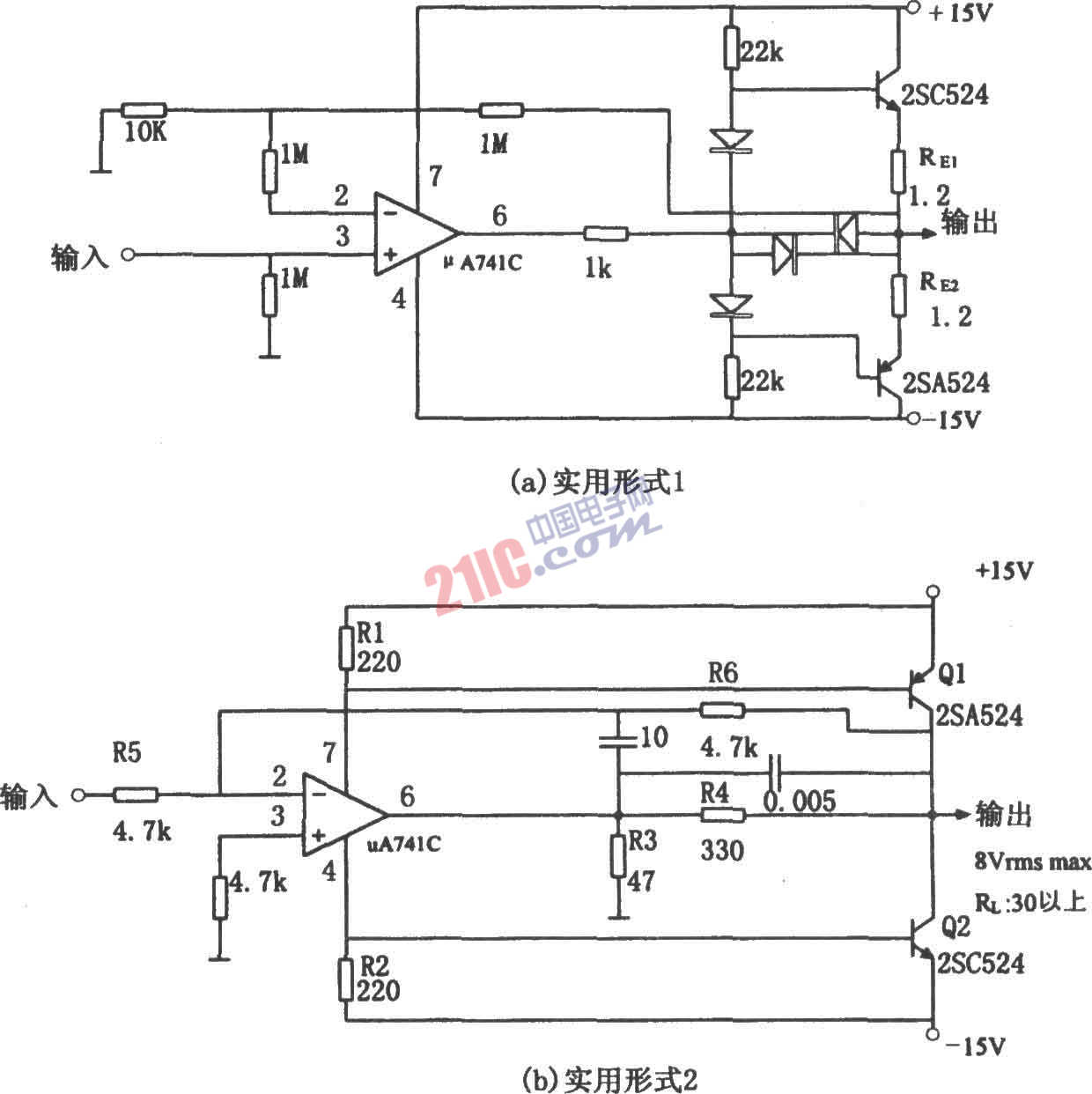 第一种实用形式如图(a)所示,该电路的结构是在运放的输出端加上互补对称射极跟随器,这种形式结构简单,使用方便,但电源利用率较低。由图(a)知,电路中两个三极管的射极分别串接了电阻RE(1.2Ω),其作用是对功放三极管实施过流保护,在集成运放的输出端(引脚6)外接1kΩ的电阻,对μA741也起过流保护作用。图(a)中,其电压放大倍数约为101,4个二极管均为1S953,功放管为对管,型号为2SC524和2SA524。