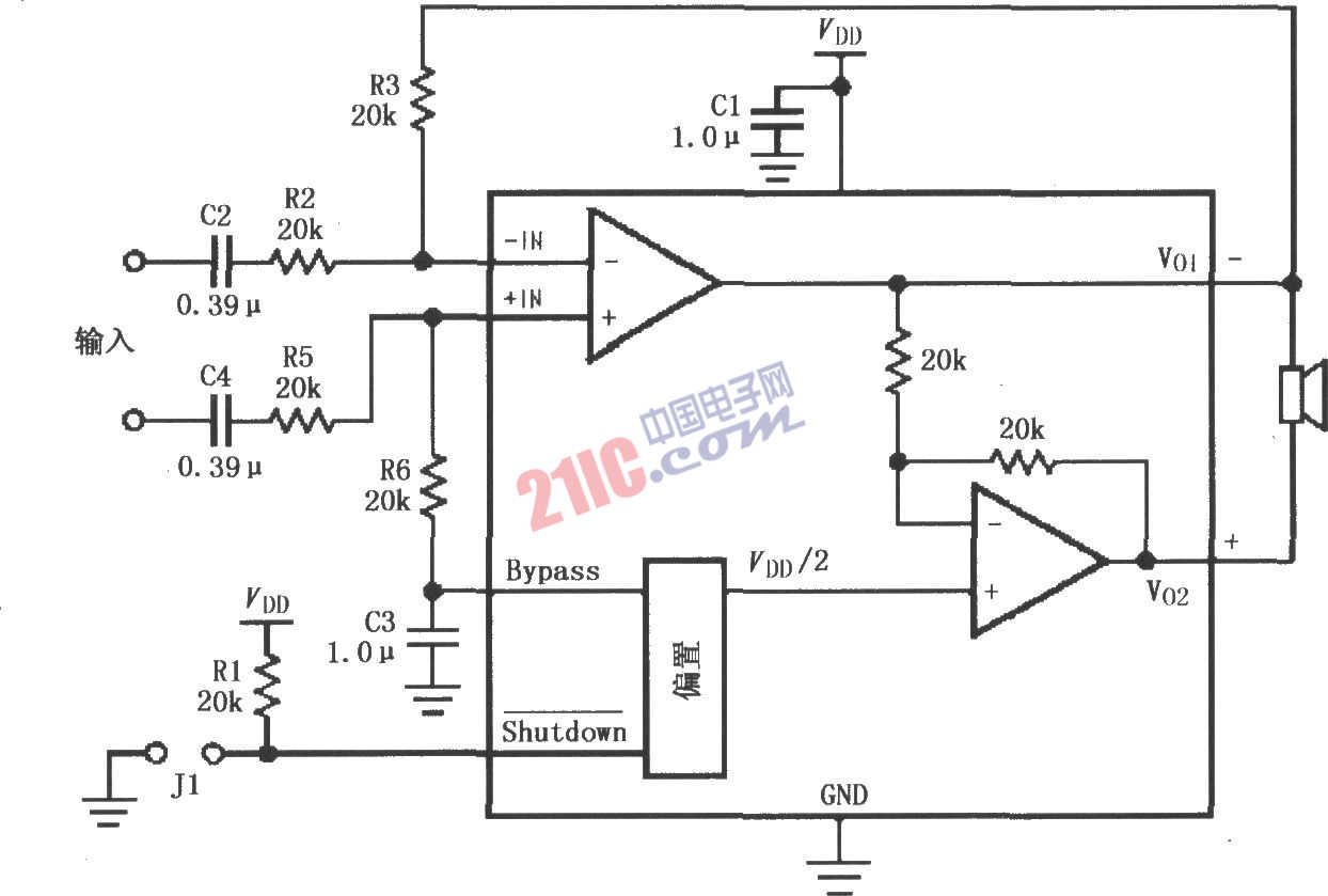 如图所示为LM4902差分输入音频放大电路。音频信号以差分的形式输入到+IN端和-IN端。