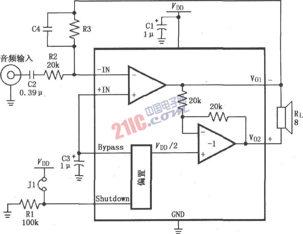 如图所示为LM4904高增益音频放大电路。J1为跳线,当J1断开时3脚接地,放大器全功率工作;当J1接通时3脚接VDD,放大器微功率关断。