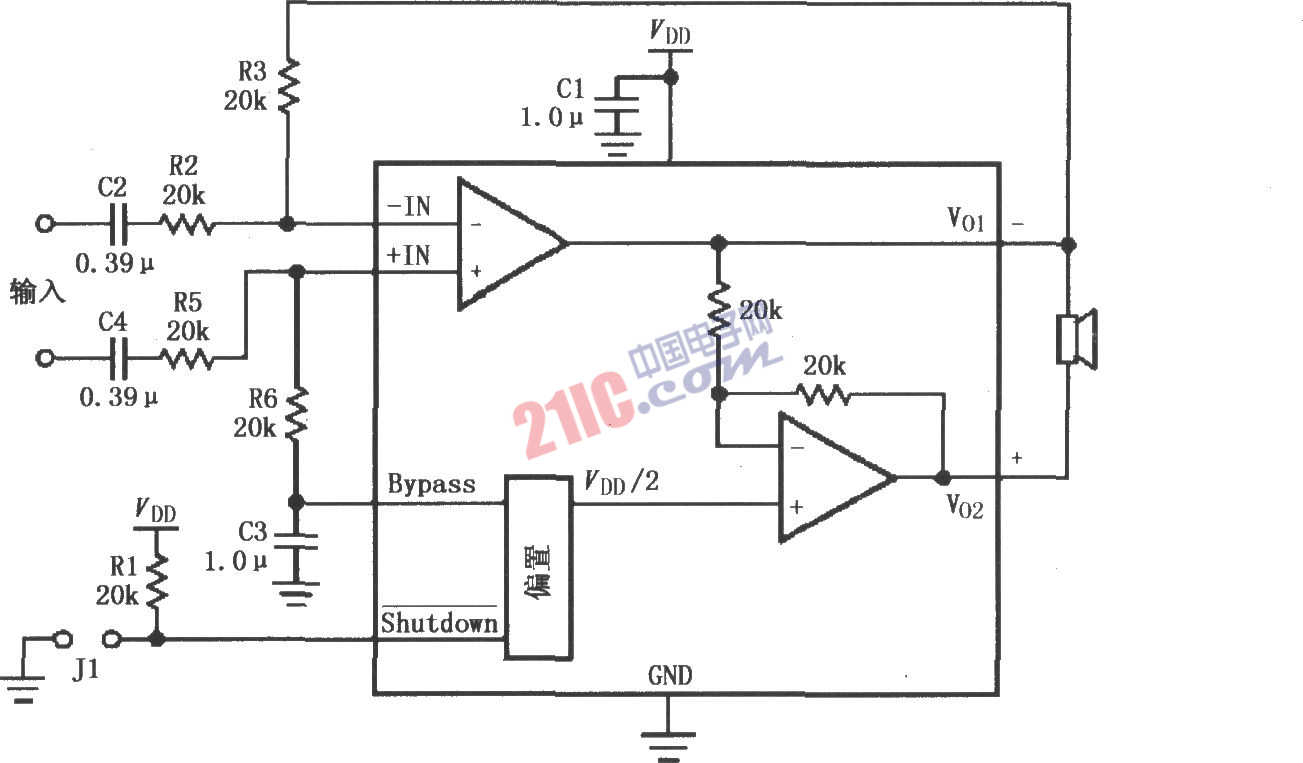 如图所示为LM4903/4905差分输入音频放大电路。音频信号以差分的形式输入到+IN端和-IN端。