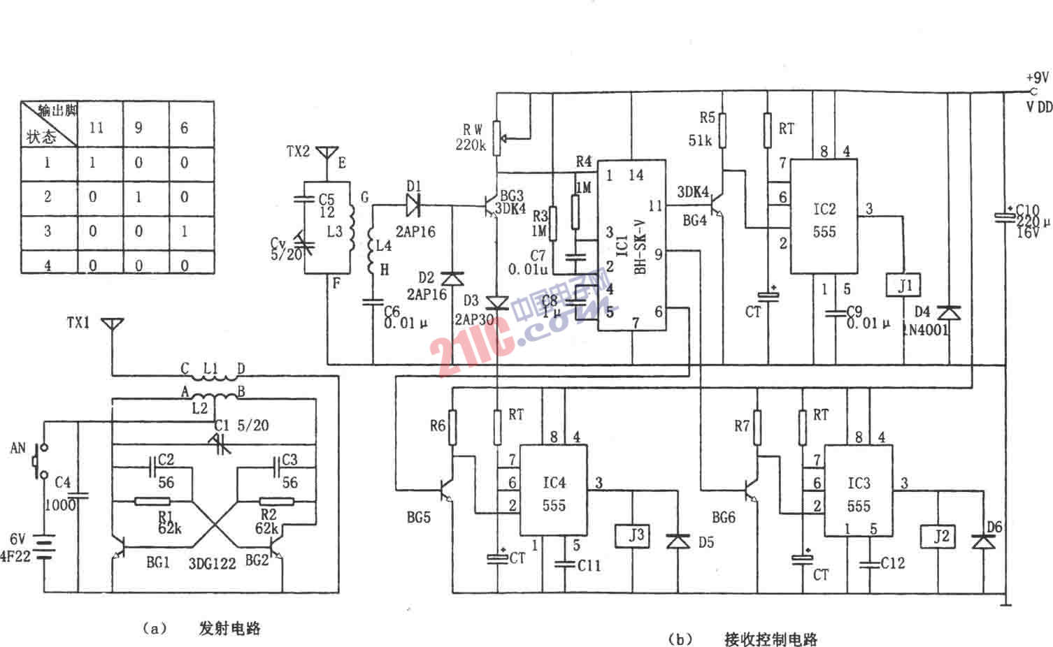 由接受器的选频回路所选出的发射的高频信号经D1、D2倍压整流,再经BG3放大后加至IC1①脚。IC1采用BH?SK?V型集成块,其内含二级高增益放大、选频、整形和触发器、驱动器。当第一次收到遥控信号后,IC1 11脚输出高电平信号,该信号经BG4倒相后触发时基电路IC2(555),使555翻转置位,继电器J1吸合,相应控制其中一种电器工作。IC2被置位,同时也开始定时,定时时间为td1=1.1RTCT,调节时间常数RTCT,则可改变该电器的工作时间。当定时时间td1到时,J1自动释放,电器自动停止工作。当IC1收到第二次遥控信号后,其11脚输出低电平(由高电平变为低电平),⑨脚则由低电平变为高电平,此时,BG6导通,使IC3置位,继电器J2吸合,相应控制第二种电器工作。当IC1收到第三次遥控信号后,⑨脚由高电平变为低电平,同时⑥脚转为高电平,使IC4置位,继电器J3吸合,相应控制第三种电器工作。当收到第四次遥控信号后,IC1 11、⑨、⑥脚全呈低电平状态,继电器J1~J3全部释放,3种电器因失电而停止工作。