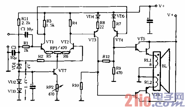 均被偏置于甲乙类工作状态,BL是双音圈扬声器,两音圈阻抗相等,以相反的相位分别直接