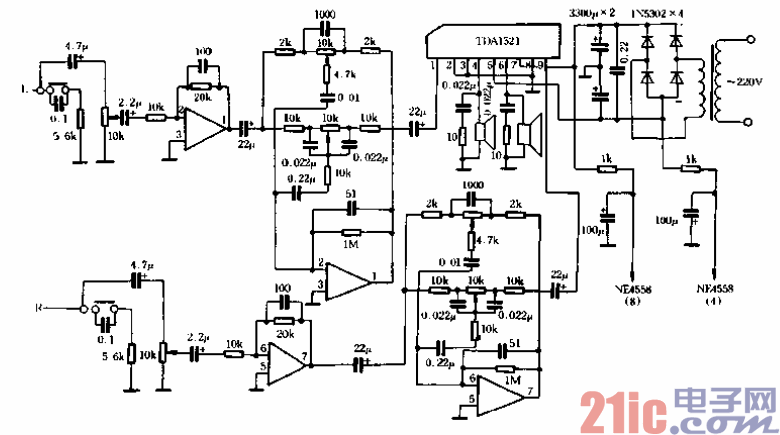 该电路前置放大部分采用运放之皇NE5532*音调调节部分选用NE4558.在低音电路中