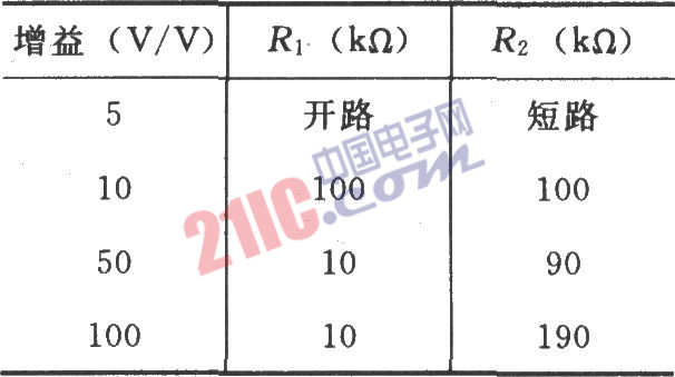 如图所示为INA331/332的信号和电源的基本连接电路。在噪声环境或高阻电源应用时,芯片电源端要用0.1μF的电容滤波,且应尽可能靠近芯片电源脚放置。输出电压以REF端为基准,REF端必须至少低于正电源电压1.2V。INA331/332的内部增益设置为5,若需要另设增益值,可在1、5脚之间和1、6脚之间分别接R1和R2来设置增益。增益与R1、R2的选择见下表,增益G=5+5R2/R1。外部增益设置电阻的选用对增益误差和增益漂移影响很大,应选用稳定性好、温度漂移小的电阻。