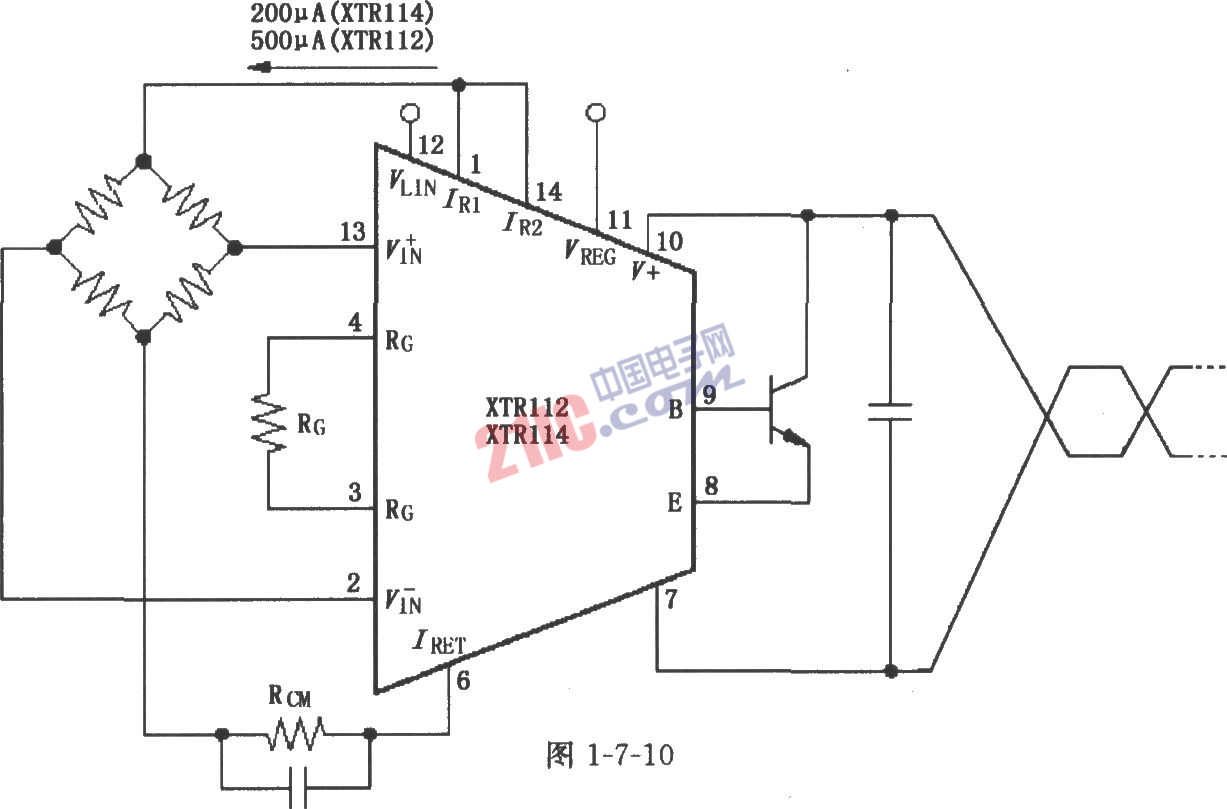 如图所示,芯片内部的两个电流源(1脚和14脚输出)提供电桥激励,每个电流源的输出为0.2mA(XTR114)或0.5A(XTR112)。用RCM调节共模输入电压,使之为1.25~3.5V。