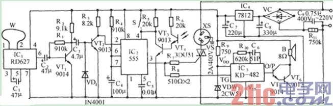 如图所示是多普勒效应和光照双控自动门插座电路(RD627) 。由多普勒效应传感头、光控开关、单稳态触发器、可控硅控制电路、乐曲发声电路和交流降压整流电路等组成。当车辆或行人走近大门口时,保安门会自动打开,同时还会播出一首悠扬的乐曲。