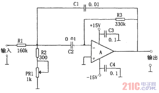 下图所示是一用单只运放组成的单峰特性滤波电路。该电路用一只运放及少许元件构成滤波器,可以获得与LC元件构成的具有同样特性的滤波器电路,在不改变电路增益的情况下,可方便调整谐振频率。本电路用电位器PR1来调整谐振频率。PR1值从最小调到最大时,谐振频率调整范围为