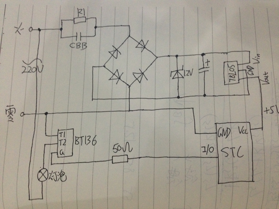 如附件所示,220V的市电经过一个60W的灯泡加载可控硅BT136的T1和T2端,可控硅控制极G经过一个50欧姆2W的电阻接到单片机的一个I/O口上。