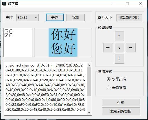 汉字取模,不限制字体、字号,支持8x8,16x16,24x24,32x32像素大小。支持单色位图生成。画图板保存为单色图片,例如用在LCD12864